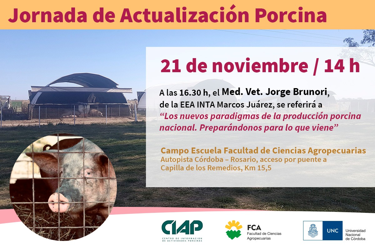 La Jornada de «Actualización Porcina» se llevará a cabo el próximo jueves 21 de Noviembre de 14:00 hs a 19:15 hs. en el Campo Escuela de Ciencias Agropecuarias de la Universidad Nacional de Córdoba (Av. Ing. Agr. Félix A. Marrone N°735, Córdoba).
