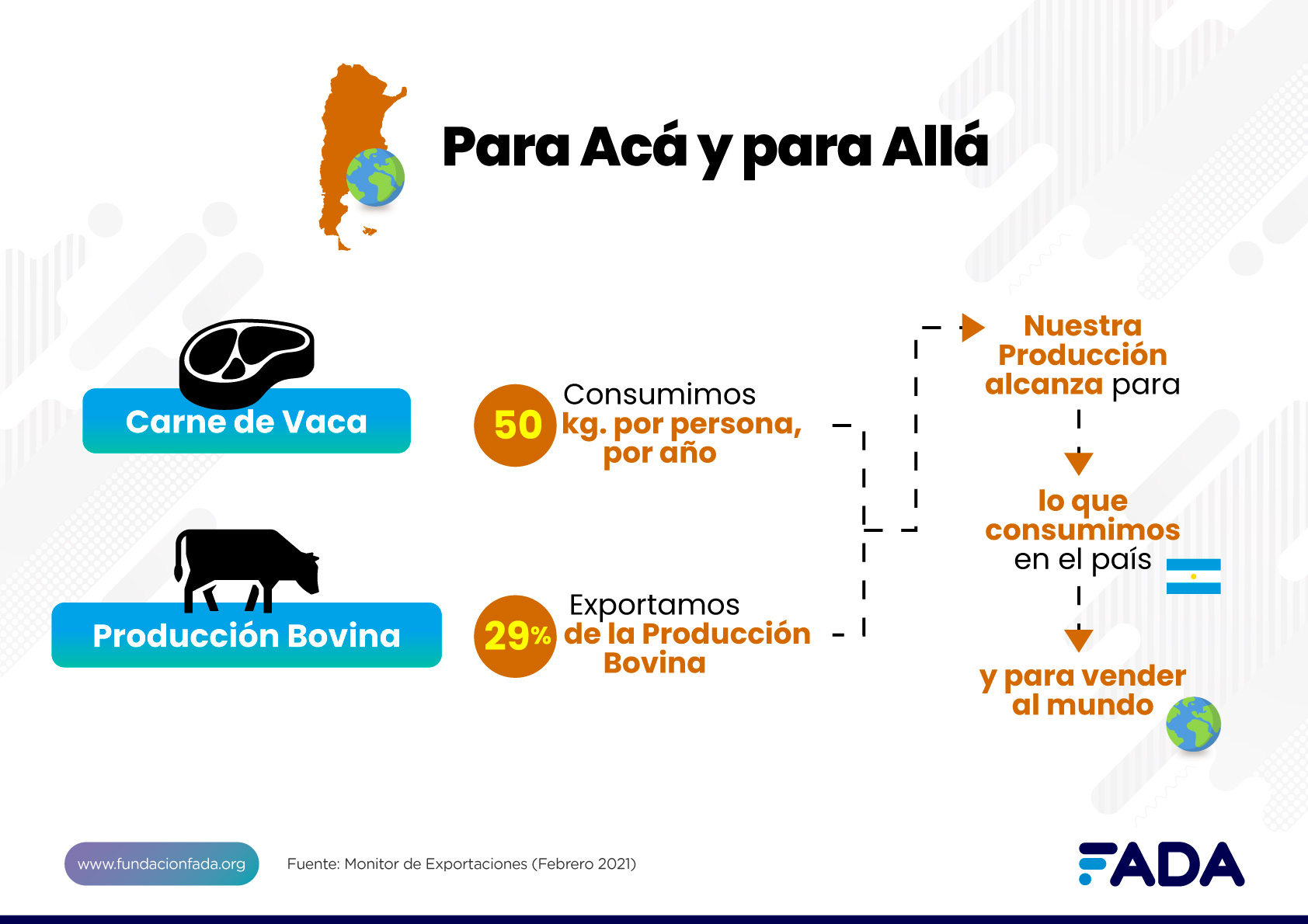 El Monitor de FADA arroja que la cadena de la carne de vaca genera más de 100 mil empleos en su circuito de exportación. “Este es sólo un ejemplo, ya que la creación de puestos de trabajo se replica en todas las cadenas agroindustriales e implica empleos de distintos tipos, afirma Pisani Claro.