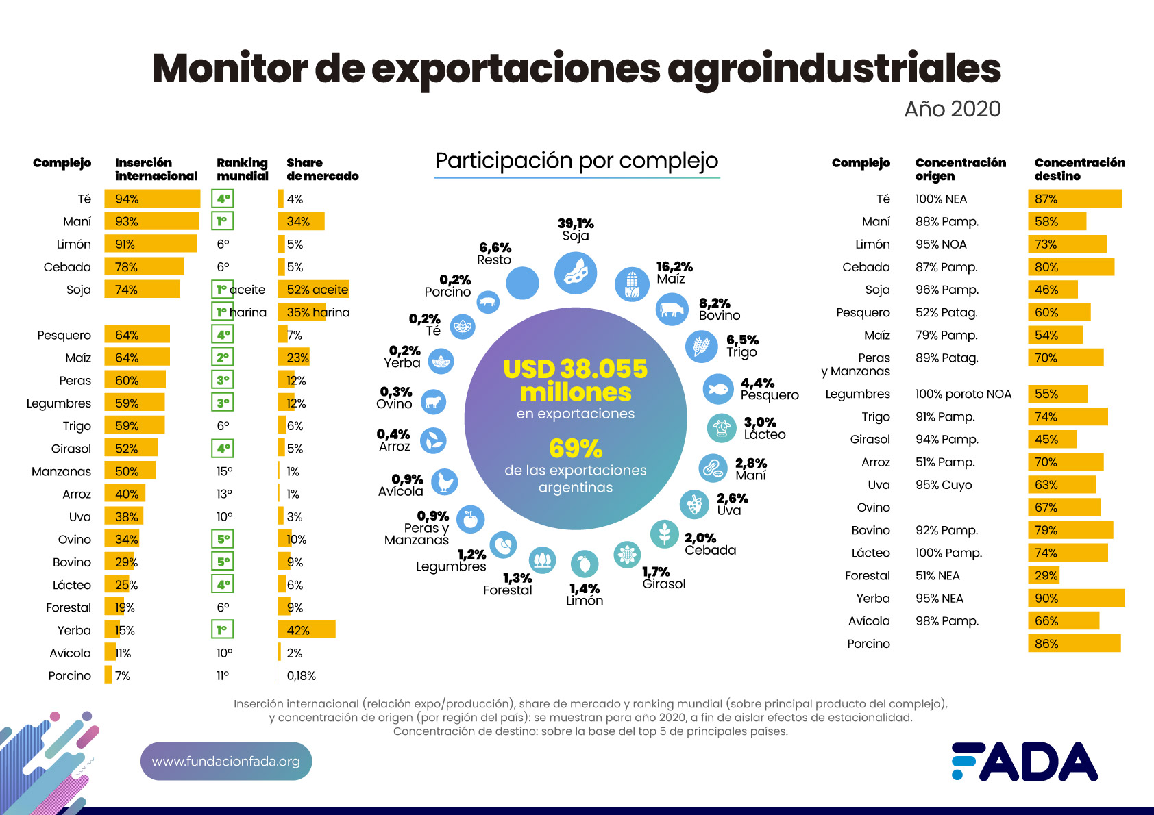 El Monitor de Exportaciones Agroindustriales, es un nuevo estudio semestral de FADA (Fundación Agropecuaria para el Desarrollo de Argentina). Una herramienta innovadora que explora el potencial de los complejos agroindustriales exportadores, derribando algunos mitos. Es un resumen de los principales datos, aportes y potencial de las exportaciones del campo. Mide la participación de las exportaciones agro en el total de las exportaciones del país y hace foco en 20 cadenas agroindustriales. Sobre estas cadenas se analizan indicadores de aporte de divisas, derechos de exportación, inserción internacional, ranking a nivel mundial, share de mercado, concentración de destinos y concentración de origen regional.