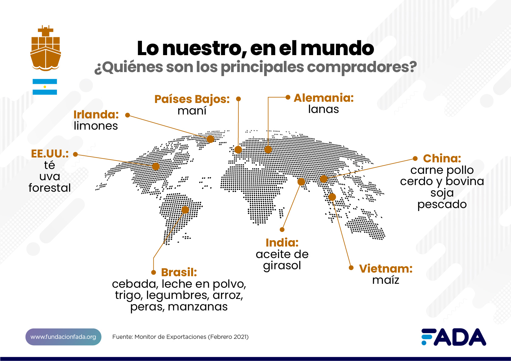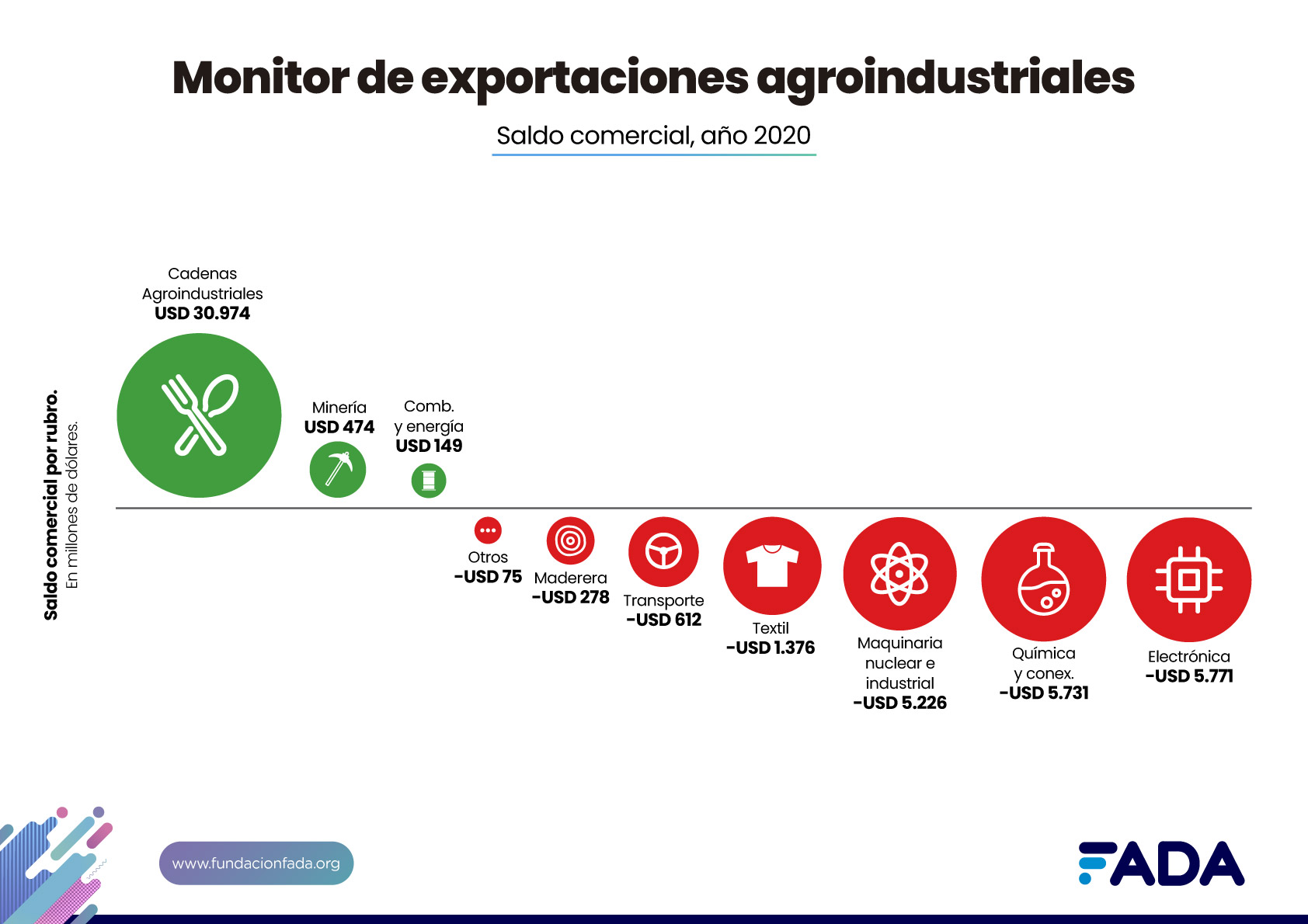 El “Monitor de Exportaciones Agroindustriales” se presenta como una herramienta que nos permite visualizar de manera rápida el gran potencial exportador de nuestra Argentina: qué producimos, para quiénes, cuánto nos compran, en qué nos beneficia producir para nosotros y para el mundo. Hay múltiples mitos en torno a los beneficios o perjuicios de las exportaciones y el estudio de FADA aporta a echar luz con datos y análisis.