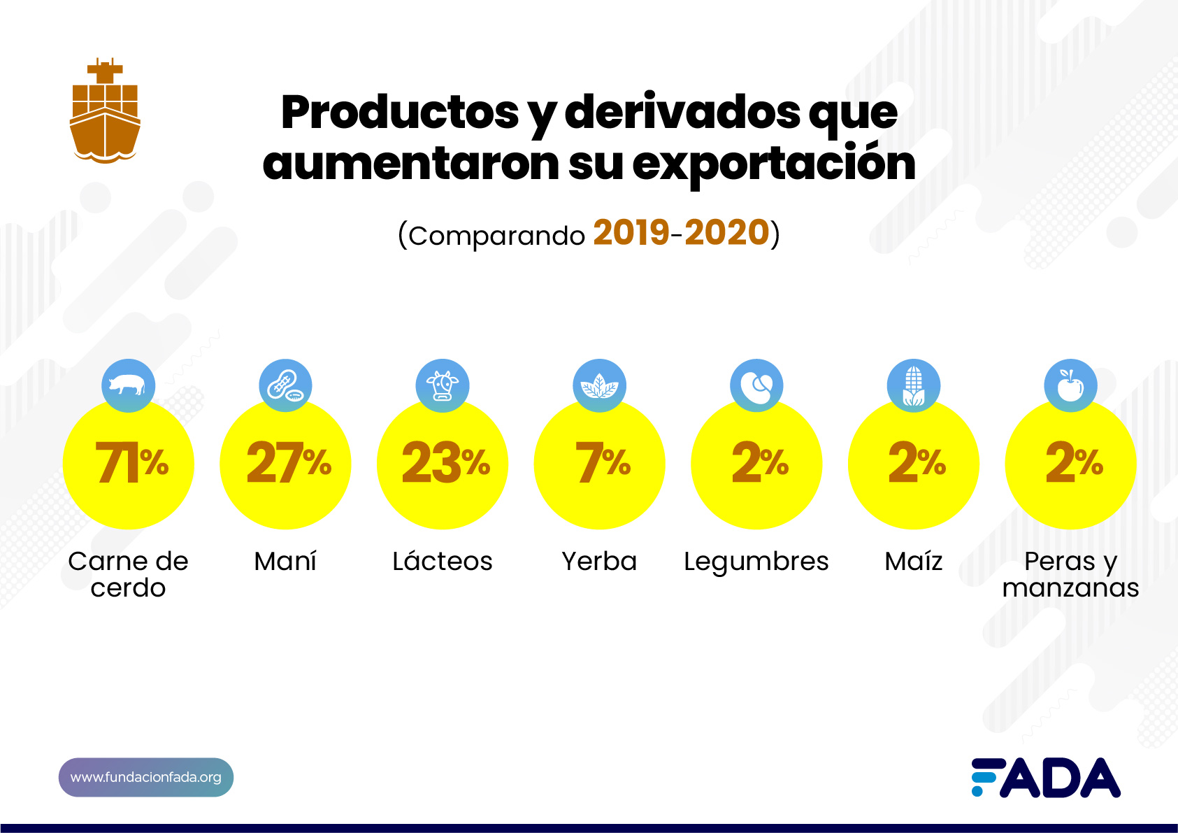 Representantes de FADA (Fundación Agropecuaria para el Desarrollo de Argentina), presentaron con invitados especiales, los números de las exportaciones de 20 complejos agroindustriales, con más de 200 datos. En el evento virtual transmitido por YouTube, que ya cuenta con más de 500 visualizaciones, participaron: Carlos Schilling, Presidente de FADA, Gustavo Vitelli, Comisión Directiva de FADA, David Miazzo, economista Jefe de FADA, Nicolle Pisani Claro, economista de FADA, María Marta Rebizo, Gerente de Asuntos Económicos y Comerciales de CIARA/CEC, Sergio Rey, Jefe Promoción Externa IPCVA, Daniel Fenoglio, Vicepresidente Asoc. Argentina Productores Porcinos y Presidente Cámara Empresarios Porcinos BA y Javier Rotondo, Presidente CARTEZ y fue Mauricio Bártoli el periodista que moderó el encuentro.