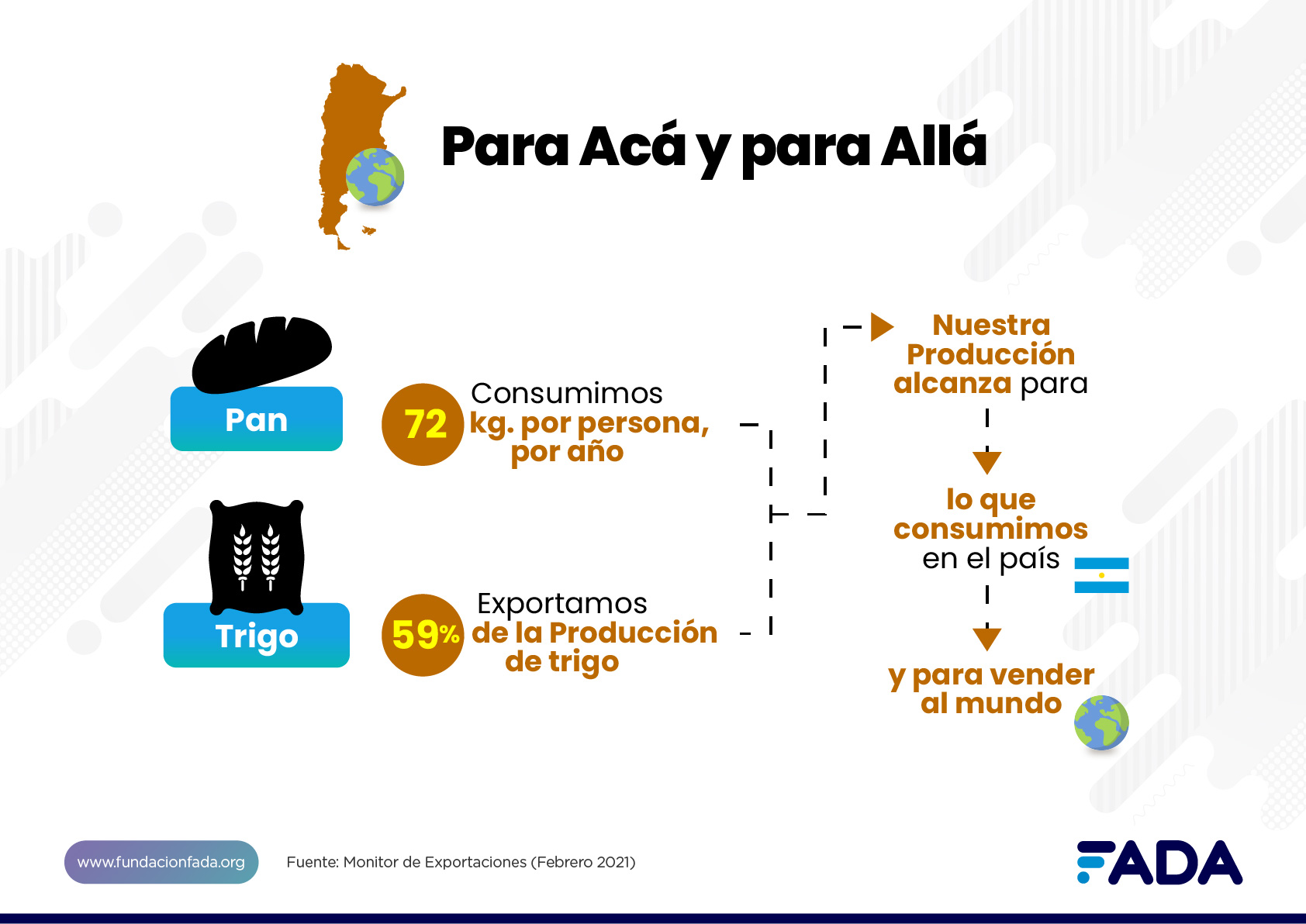 “En las exportaciones no solamente se genera empleo, también se genera dinamismo, arraigo: las exportaciones no son un antagonismo con la producción interna y la garantía de que lleguen los alimentos a la mesa de los argentinos. Es un ganar-ganar: cuantas más exportaciones haya, más dinamismo hay en el país y en las distintas regiones. Ese es el mensaje que deja este trabajo”, estas fueron las palabras con las que el periodista Mauricio Bártoli abrió la charla virtual de FADA. “Una cosa no quita a la otra. Argentina no tiene un problema de producción de alimentos sino un problema de distribución y acceso económico a los alimentos: somos el quinto país a nivel mundial que más consume pan y también exportamos el 59% del trigo, alcanza para abastecer el mercado interno y también el externo”, afirma Pisani Claro. “Por lo que lo más importante es producir más y exportar más para generar más empleo”, agrega Miazzo.