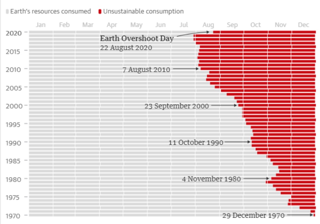 El cambio de tres semanas entre las fechas del Día del Sobregiro de la Tierra en 2019 y 2020 representa el mayor cambio de un solo año desde que comenzó el sobregiro mundial en la década de 1970. Desde entonces, el aumento de la población y el incremento de los niveles de consumo per cápita han hecho que el Día del Sobregiro en la Tierra se adelante en el año, y que la fecha llegue en julio por primera vez en 2019.