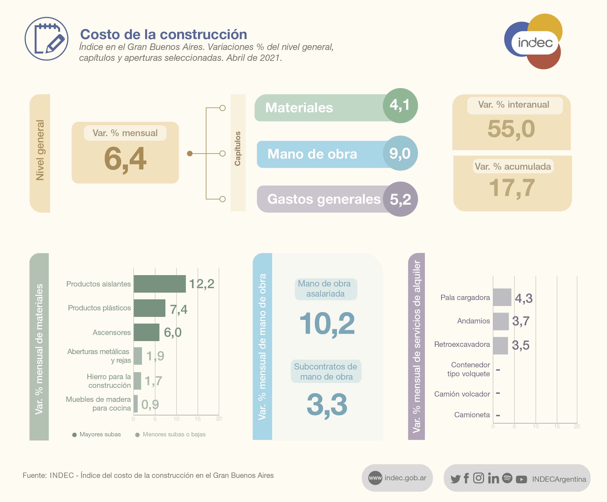 Según el Indec, «este resultado surge como consecuencia del alza de 4,1% en el capítulo materiales, de 9,0% en el capítulo mano de obra y de 5,2% en el capítulo gastos generales».