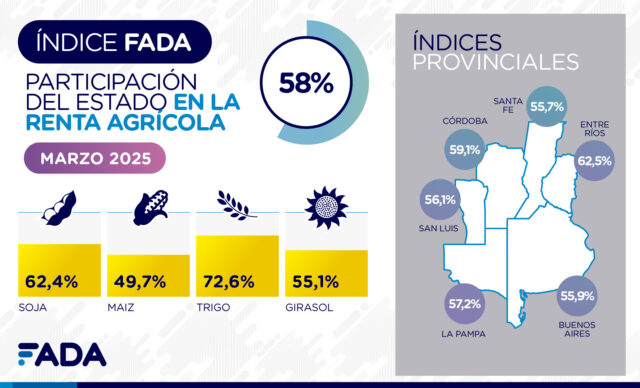 La nueva medición del Índice FADA muestra que la participación del Estado en la renta agrícola es de 58%.