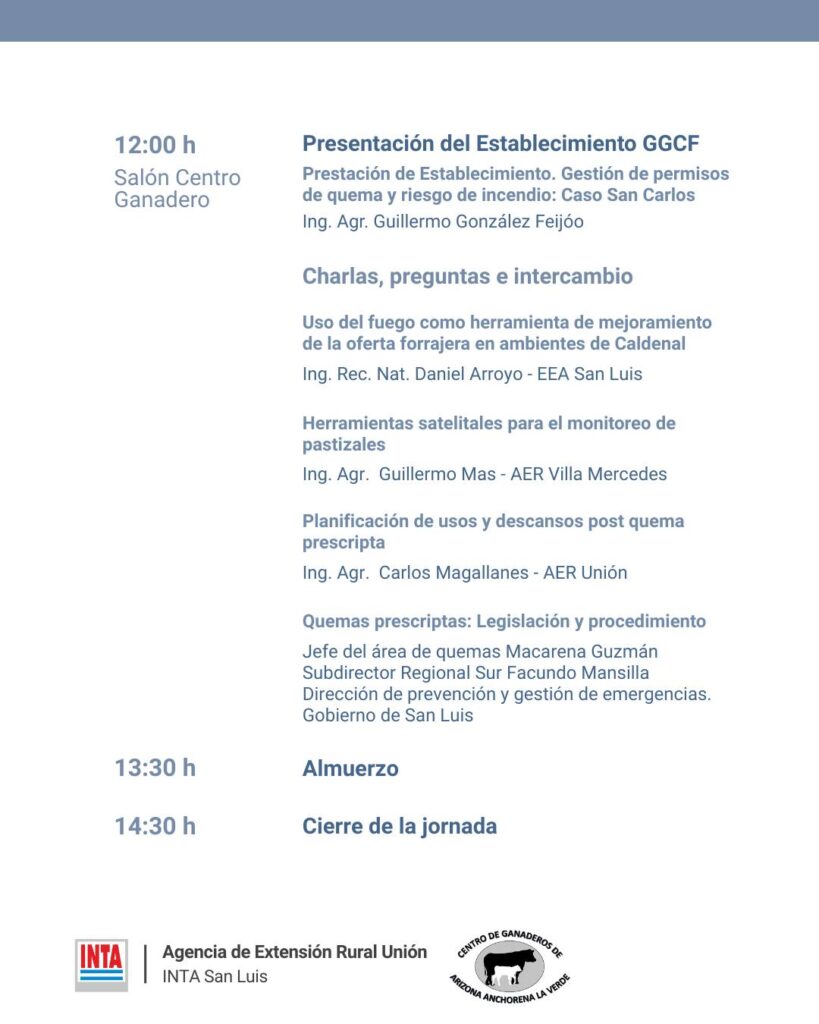 A las 12:00, las actividades se trasladarán al Salón del Centro Ganadero, donde se presentará la experiencia del Establecimiento GGCF y se expondrá el caso San Carlos en torno a la gestión de permisos de quema y la reducción del riesgo de incendios, a cargo del ingeniero agrónomo Guillermo González Feijóo.