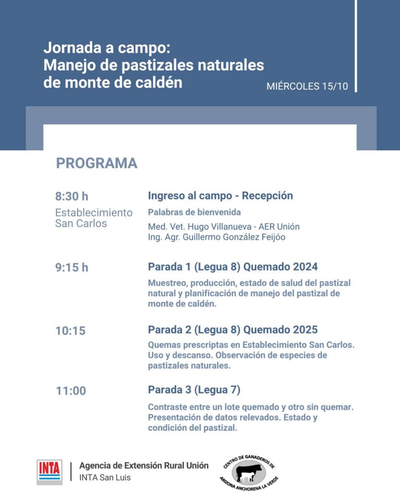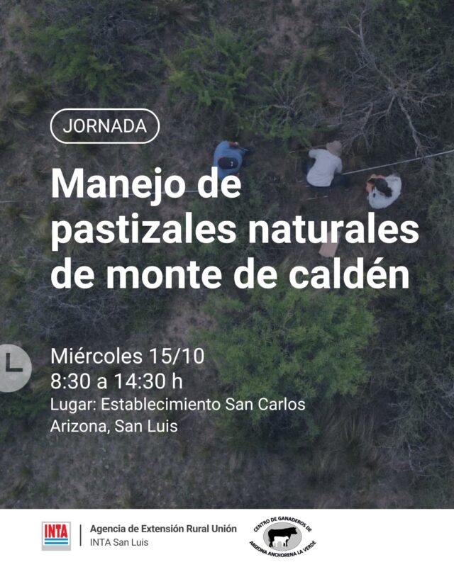 San Luis se prepara para vivir una jornada clave destinada a productores ganaderos, técnicos y público en general interesados en el manejo sustentable de los pastizales naturales del monte de caldén, un ecosistema estratégico para la región centro-oeste de la provincia. El encuentro se realizará el miércoles 15 de octubre en el Establecimiento San Carlos, y contará con la participación de especialistas del INTA, del Centro de Ganaderos de Arizona-Anchorena-La Verde y de organismos provinciales vinculados a la gestión del fuego y el uso racional de los recursos forrajeros.