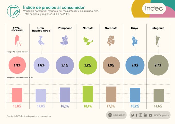 Por otro lado, el Gran Buenos Aires fue la que menor incremento registró el mes pasado, al informar 1,6%. Al mismo tiempo, con el incremento de julio se ubicó anteúltima en la variación respecto a diciembre: el total acumulado es de 14,8%.