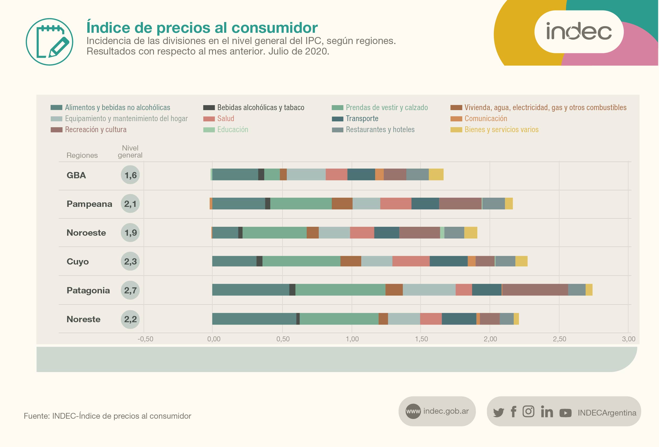 Asimismo, la región Pampeana alcanzó el tercer lugar a partir del aumento de 2,1% en los precios evaluados por el INDEC. En cuanto a la sumatoria anual, el IPC para dicha zona fue de 16,5%, colocándose tercera a nivel nacional.