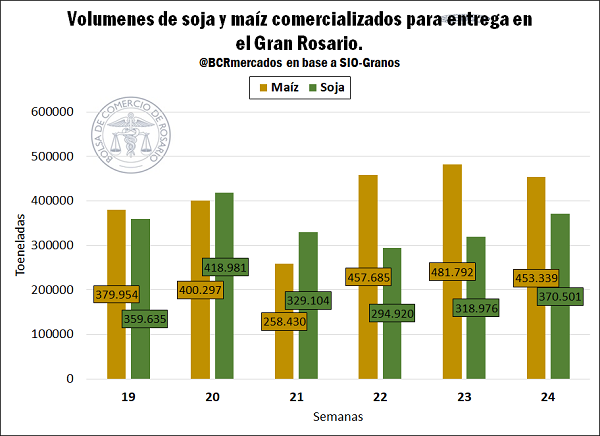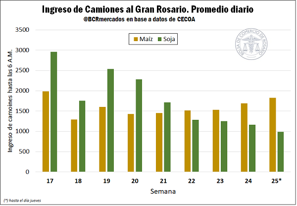 En la semana que terminó el domingo último, el ingreso de camiones portando maíz a las terminales de la zona promedió casi 1.700 camiones diarios, considerando la posición de camiones hasta las 6 a.m. según informa el Centro de Entregadores de Cereales, Oleaginosas y Afines (CECOA), un crecimiento de un 10% en relación a la semana previa, y por encima de la campaña previa en la misma semana. La seca de los últimos meses sobre áreas con maíces de siembra tardía, principalmente en la provincia de Córdoba, habrían apurado la maduración de los cultivos, y apresuran el ingreso de mercadería que se proyectaba cosechar recién entrado julio. A nivel nacional, la cosecha del cereal abarca ya un 78% de la superficie a trillar según datos del MAGyP, adelantándose 17 puntos porcentuales al avance del año pasado.