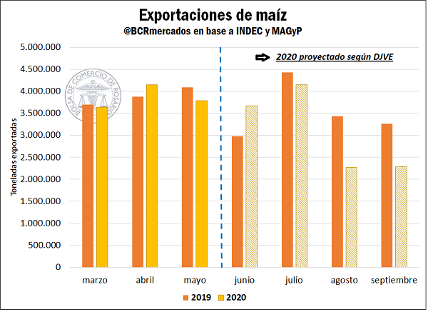 Para embarcar entre julio y septiembre, ya se declararon ventas al exterior por unas 8,7 Mt de maíz, con julio cómo el punto álgido de la campaña, superando los 4,1 Mt en DJVE.