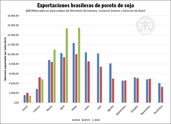 Las exportaciones brasileras de soja acaparan parte de la atención de los agentes en el mercado internacional de la oleaginosa. Actualmente el país vecino ha incrementado fuertemente los volúmenes remitidos más allá de sus fronteras. El desempeño de esta última campaña refleja un incremento por sobre las dos campañas anteriores. La variación interanual para los meses de marzo, abril y mayo reflejan incrementos del 30%, 63% y 55% respectivamente. Además, en estos 3 meses el volumen exportado superó las 10 Mt y en abril y mayo superó los 15 Mt.