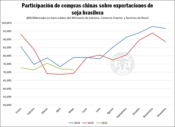 Contrariamente a lo que se podría suponer, teniendo en cuenta los momentos de tensión comercial por los que atravesaron Estados Unidos y China, la participación del país asiático no aumentó dentro del volumen de exportaciones. Para el período que va desde enero del 2018 a mayo del 2020 el promedio de compras efectuadas por el gigante asiático representaron el 81% del volumen exportado por Brasil. De todas formas, cabe aclarar que según los años analizados la participación sobre el total de soja exportada comienza a aumentar a partir de julio. Finalmente, los volúmenes importados por China sí crecieron, al mismo tiempo que se incrementaban las exportaciones de oleaginosa brasilera, pero no lo suficiente como para superar la participación de otros años.