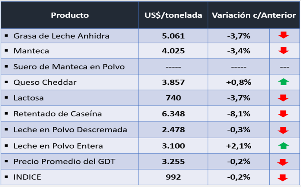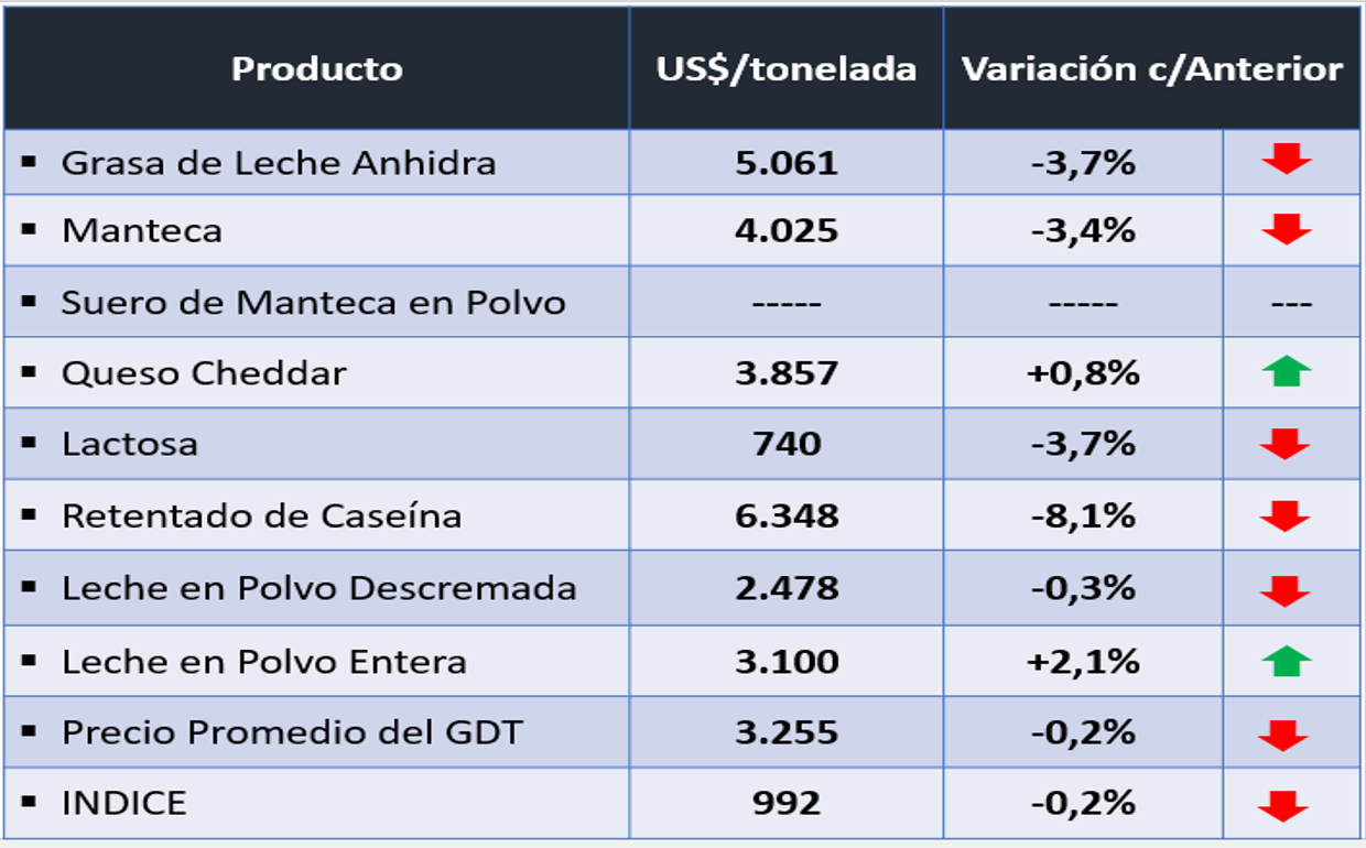Se realizó este martes la segunda subasta del GDT para el mes de agosto, en donde la leche en polvo entera cerró en U$S3.100 la tonelada. Junto al cheddar, fueron los dos únicos productos con subas en el mercado internacional de lácteos.
