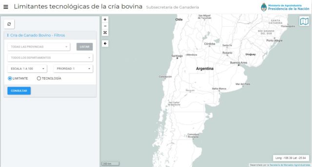 El Visualizador se desarrolla a través de un mapa de la República Argentina, a nivel provincial y departamental, donde se podrá buscar allí tanto las «limitantes» de la actividad como las distintas «tecnologías» asociadas a la cría, a través de distintos filtros como: Provincia; Partido; Escala de Producción y Prioridad.