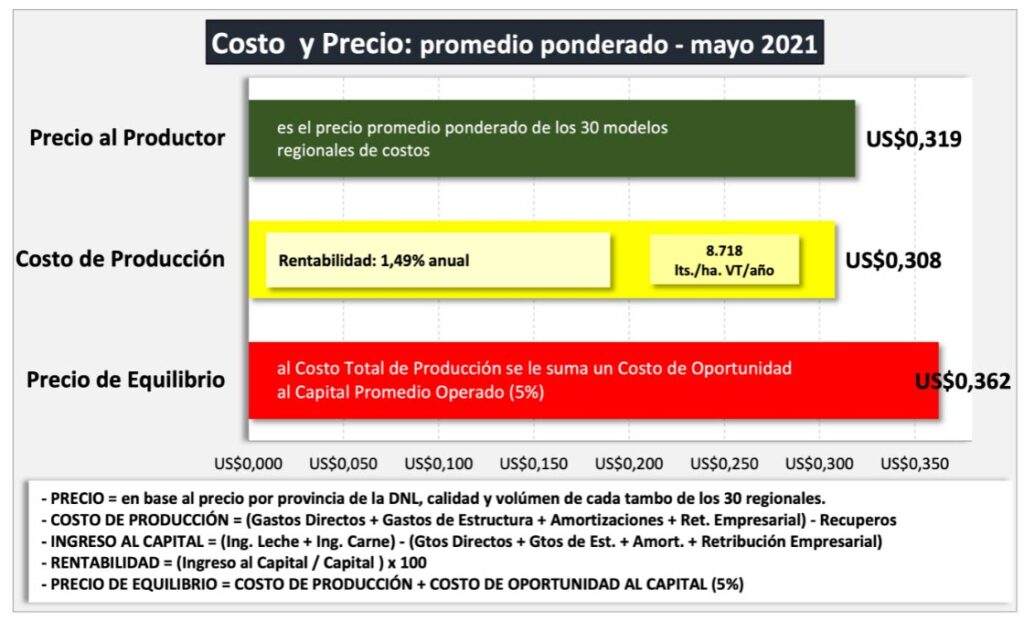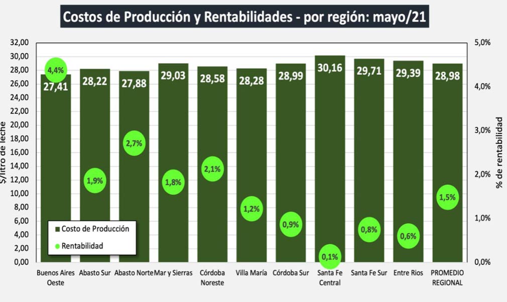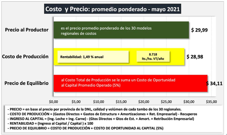 En su reporte denominado Costos Regionales de Producción de Leche, el Observatorio de la Cadena Láctea informó que el precio de la leche al productor para el mes de mayo del 2021 fue de $ 29,77/litro (SIGLeA) y $ 30,37/litro (Panel 18 Empresas).