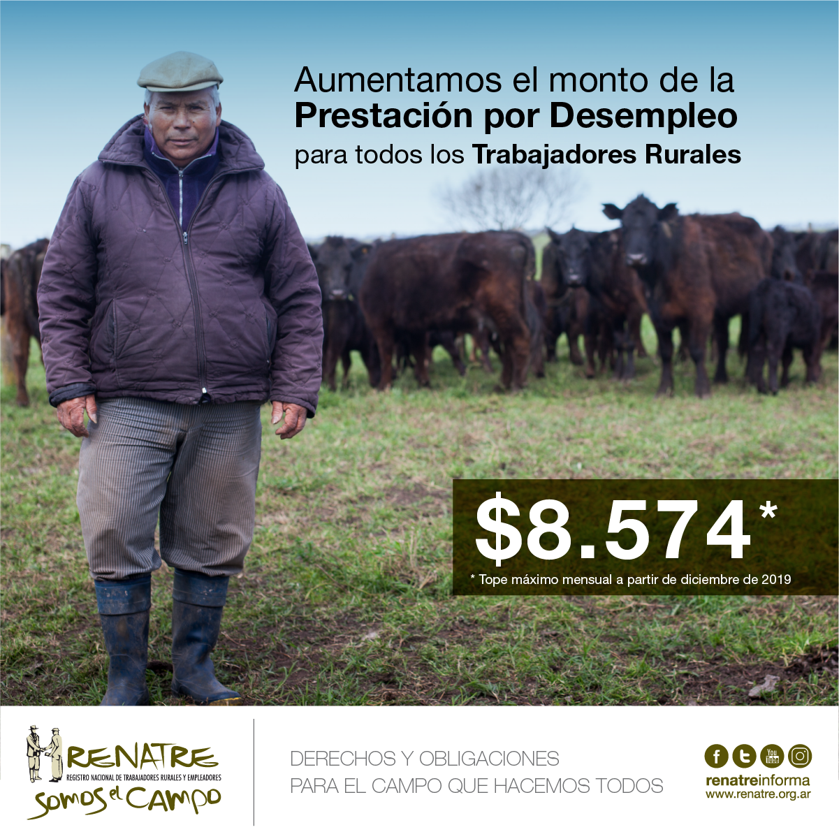 El RENATRE (Registro Nacional de Trabajadores Rurales y Empleadores) resolvió incrementar el monto máximo a $8.574, que se aplicará para todas aquellas prestaciones por desempleo que deban percibirse a partir del mes de diciembre de 2019.