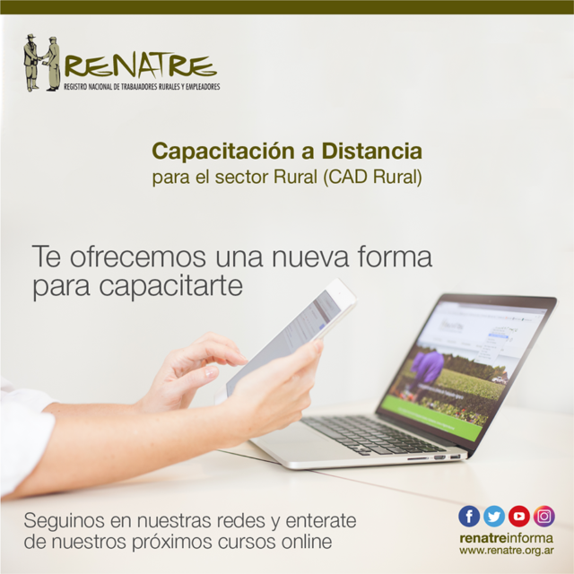En el marco de la Pandemia provocada por el Coronavirus, el RENATRE (Registro Nacional de Trabajo Rural y Empleadores), comenzará a realizar capacitaciones virtuales con el objetivo de continuar brindando herramientas para trabajadores rurales y empleadores en busca de mejorar las condiciones de trabajo y la producción en el sector rural.