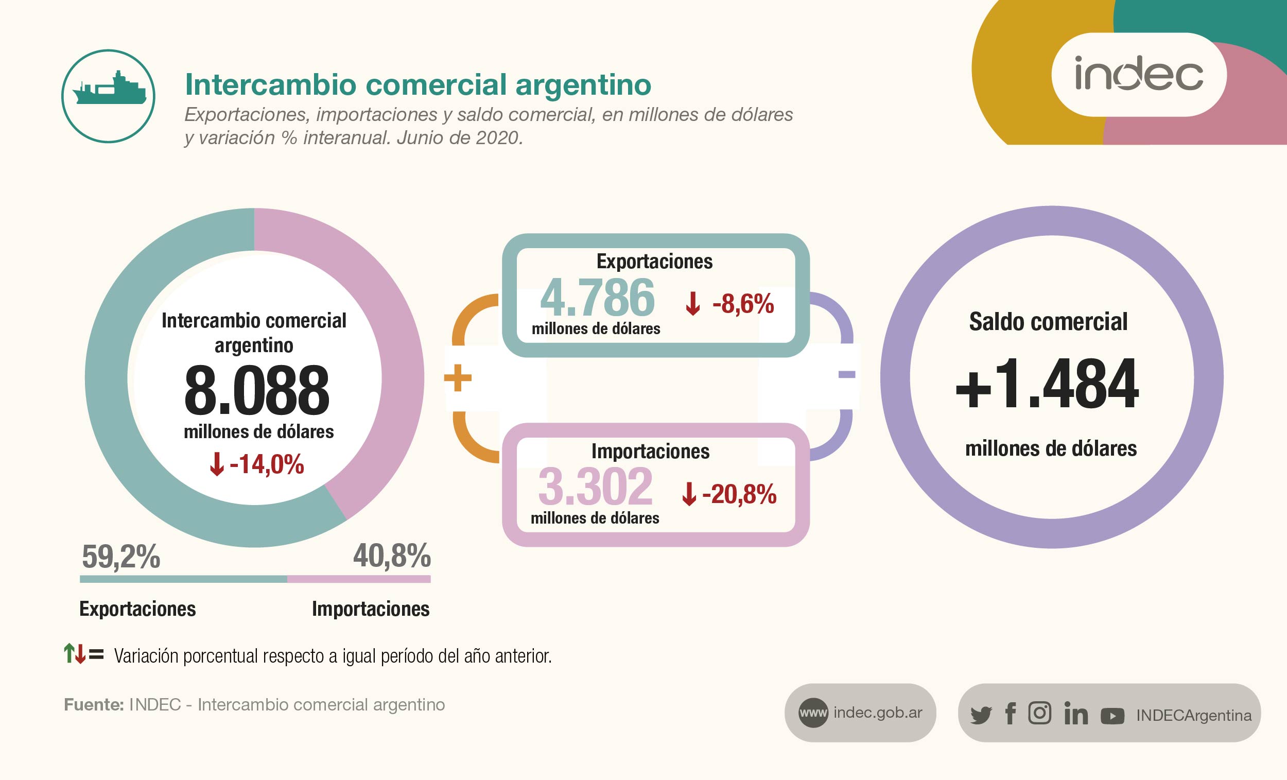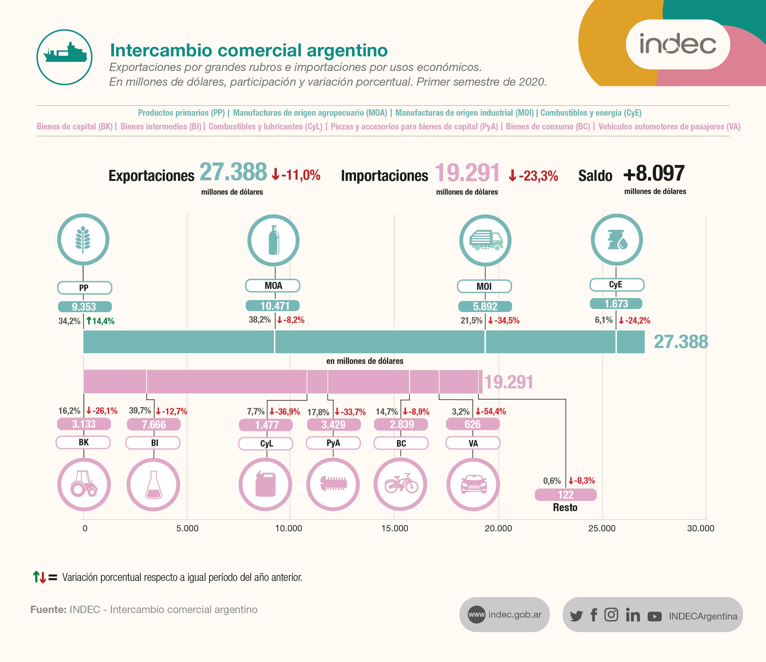En el primer semestre de 2020, Argentina registró un superávit comercial de u$s8.097 millones, según lo informado este martes por el INDEC, lo cual significó un crecimiento del 44,8% respecto de los u$s5.589 millones que se habían obtenido en el mismo período pero de 2019. En junio, tanto las exportaciones como las importaciones atenuaron las caídas que venían mostrando en los meses previos.
