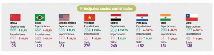 Los saldos positivos más importantes se generaron en el comercio con Vietnam, país al cual se exportó mercadería por un total de u$s334 millones, y con Egipto, que aportó u$s269 millones en concepto exportaciones.