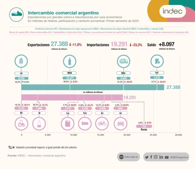 A raíz de la pandemia de coronavirus, los primeros seis meses del año estuvieron marcados por un fuerte descenso en el intercambio comercial con el resto del mundo, que disminuyó un 16,6% interanual. Mientras las exportaciones cayeron un 11%, las importaciones se derrumbaron aun más, un 23,3%, afectadas también por la caída de la actividad económica que ya acumula más de dos años.