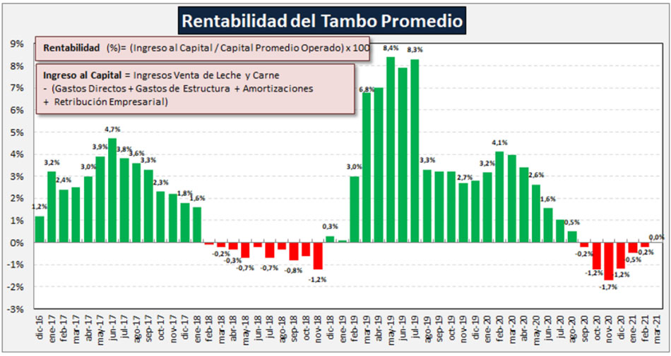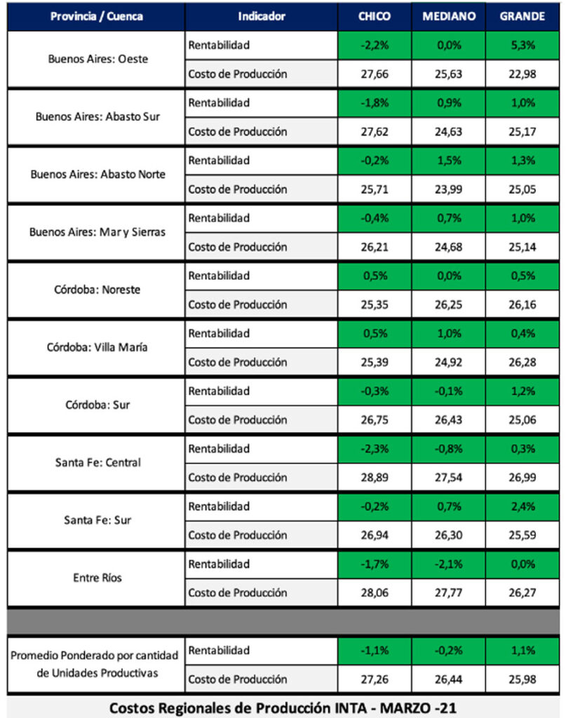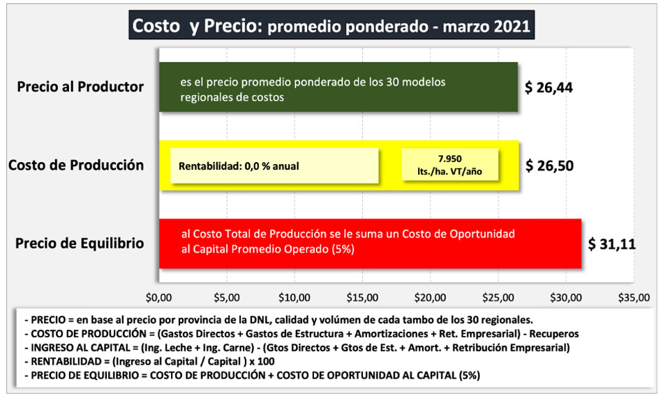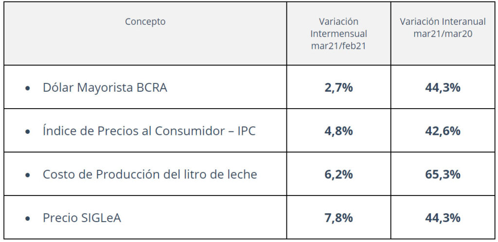 El informe Costos Regionales de Producción de Leche, valores actualizados a marzo de 2021 elaborado por el Observatorio de la Cadena Láctea sobre datos generados por el INTA indica que el precio de la leche al productor para el mes de marzo del 2021 fue de $ 26,09/litro de acuerdo lo que reportó el SIGLeA y de $26,64/litro si solo se toma en cuenta el panel de 18 Empresas.
