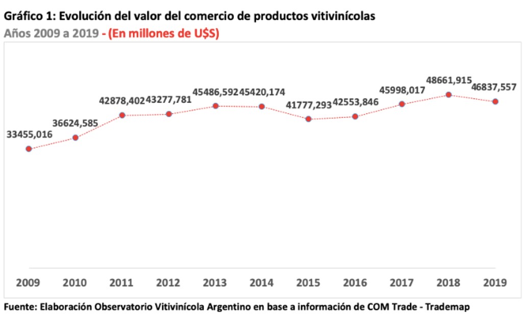 Mientras que en 2009 las exportaciones se basaban casi exclusivamente en vino fraccionado y jugo de uva concentrado (JUC), por un total de 855 millones de dólares, el crecimiento de la demanda comenzó a reflejarse con nuevos protagonistas en la cartera de la industria, como el vino a granel y las pasas de uva. Al finalizar 2019 las exportaciones alcanzaron los u$s 1.023 millones, demostrando un crecimiento del 19,7% en su facturación.