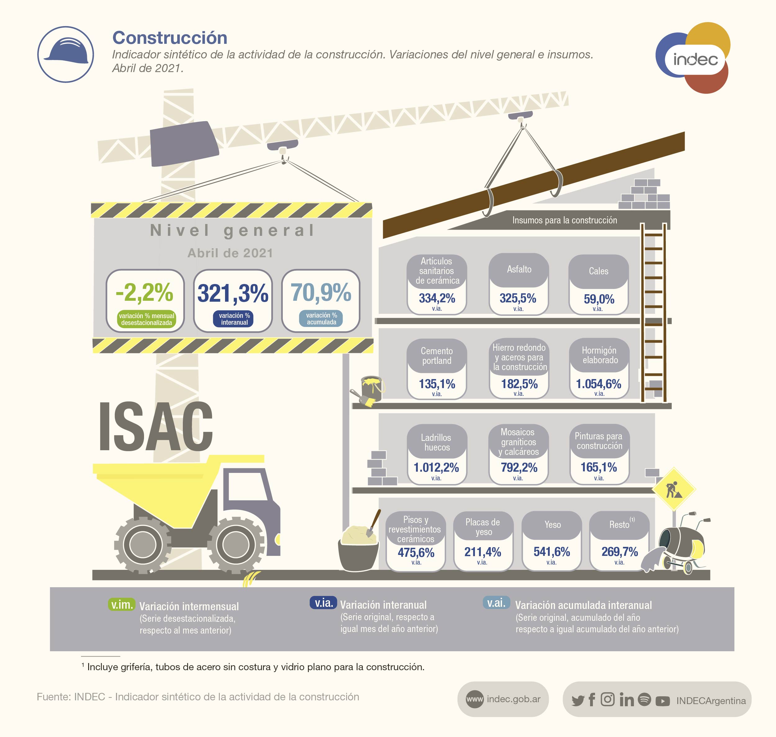 Este martes, el Indec informó que en abril de 2021 el indicador sintético de la actividad de la construcción (ISAC) muestra una suba de 321,3% respecto a igual mes de 2020. El acumulado del primer cuatrimestre de 2021 del índice serie original presenta una suba de 70,9% respecto a igual período de 2020.