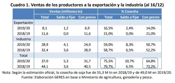 Según datos del Ministerio de Agricultura, los productores llevaban vendido 44,1 millones de tonadas (según los registros hasta el 16 de diciembre). Este volumen equivale al 75,5% de la cosecha 2019/20 (49 millones), por debajo del 79,7% (de la producción 2018/19) registrado a igual fecha de 2019, ya sea con precio fijado o pendiente. «La diferencia de 4,2 puntos porcentuales aplicados a la cosecha 2019/20 implica un retraso de 2,1 millones de toneladas con relación a la campaña previa», explica un informe del Grupo de Estudios de la Realidad Económica y Social (GERES) .