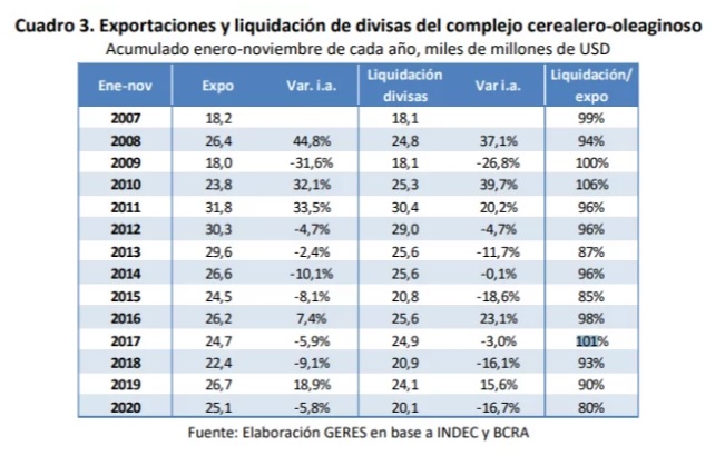 El relevamiento considera que «se perdió un ingreso de divisas de 4.126 millones de dólares en el período enero-noviembre, en comparación con el ritmo de ventas y de liquidación de divisas del promedio de los últimos años». Esta cifra equivale a 3.388 millones de dólares por menor liquidación de divisas (referidas a las ventas externas realizadas) y 738 millones por menor exportación de poroto y molienda en el actual año comercial.