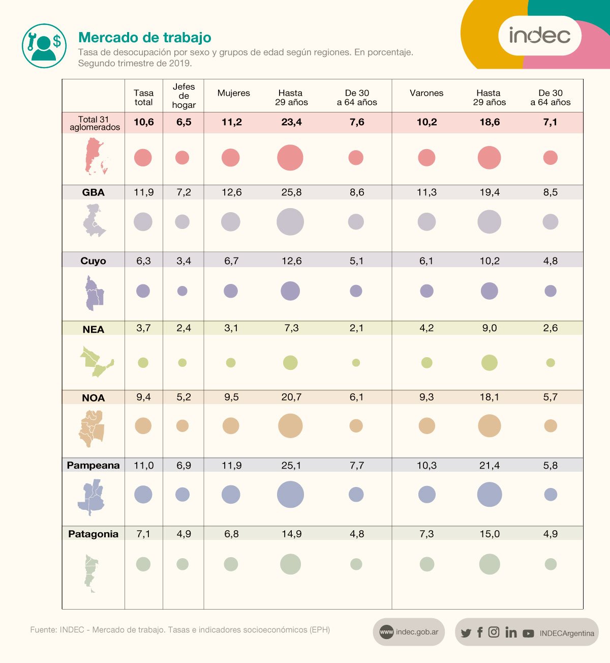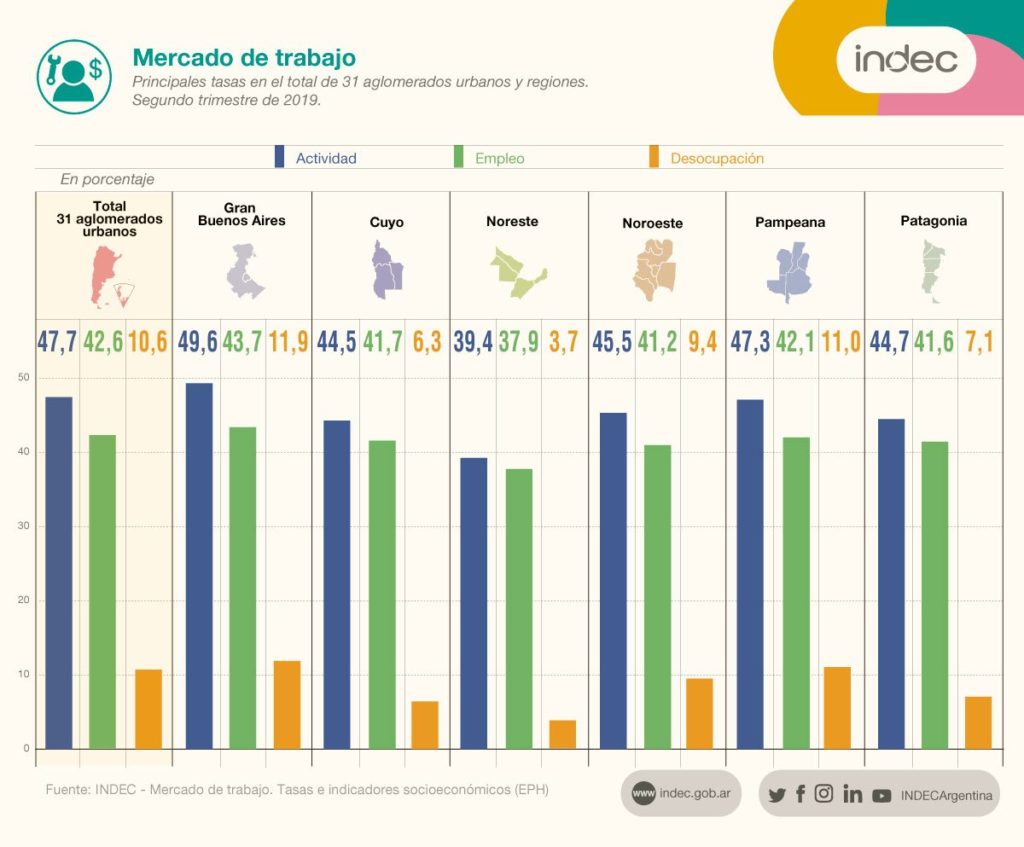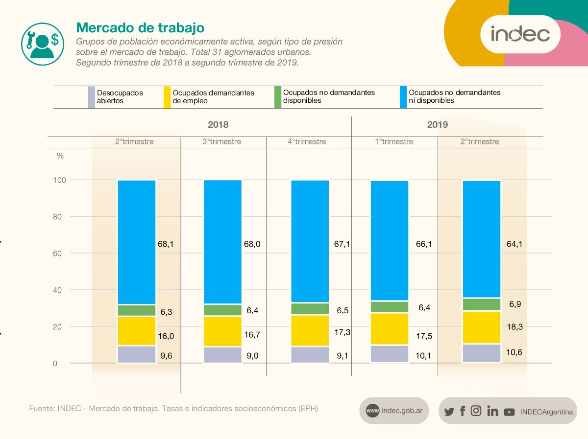 La tasa de desempleo de la Argentina aumentó a un nivel de 10,6% en el segundo trimestre de 2019, contra un 9,6% anotado en igual período del año previo, anunció este jueves el Instituto Nacional de Estadística y Censos (INDEC).