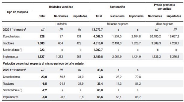 En el primer trimestre de 2020, los tractores participaron con el 33,0% de la facturación total, con 4.318,0 millones de pesos; las cosechadoras tuvieron un 31,1% de participación, con 4.062,3 millones de pesos; los implementos tuvieron un 26,7% de participación, con 3.489,8 millones de pesos; y las sembradoras, el 9,2% restante, con 1.202,7 millones de pesos.