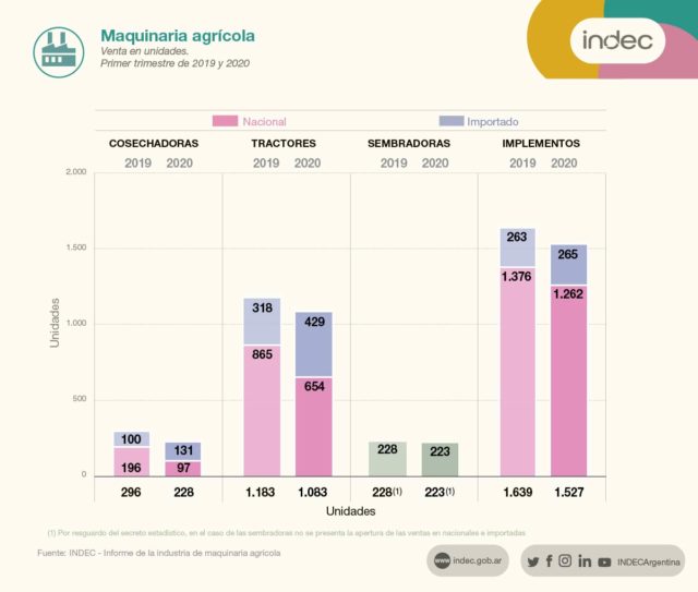 La menor facturación (en términos reales) en el primer trimestre de 2020 tiene que ver con que las unidades vendidas de todos los segmentos de maquinarias registraron una disminución respecto a igual trimestre del año anterior. Las cosechadoras presentaron la mayor caída con 23,0%; los tractores disminuyeron 8,5%; los implementos, 6,8% y las sembradoras, 2,2%.