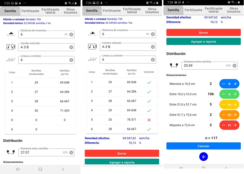 “Al usar la aplicación y definir los parámetros de la labor, se puede calcular la densidad de siembra expresada en diferentes unidades de interés agronómico, en distribuciones monograno y a chorrillo, para siembras en plano, en surco y en tablón o cantero”, indicó el especialista del INTA y agregó: “También es posible determinar las prestaciones de dosificación, de fertilizantes, uniformidad transversal y distribución en la línea de siembra”.