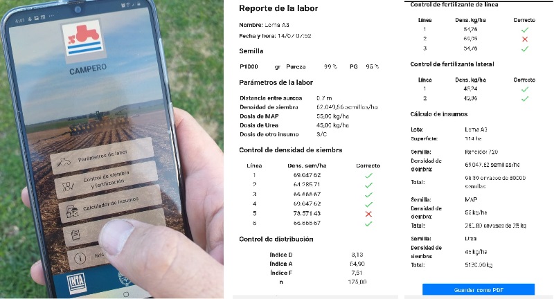 Para el control de densidad de siembra, “Campero permite el ingreso de la cantidad de semillas recolectadas por cada línea, realiza un diagnóstico rápido línea por línea y calcula la diferencia con la densidad teórica. Esta utilidad de verificación también se aplica para fertilización lateral y en la línea”, explicó el especialista del INTA.