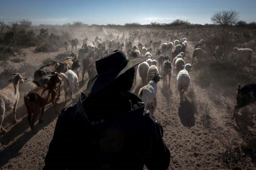 Sopla viento sur en el secano lavallino, el frío no parece alterar la actividad en el puesto Díaz. Amaneció hace un par de horas y las cabras dejan de amamantar a sus crías. Una nube de polvo, el olor a guano y el balido caprino inundan el seco paisaje del norte provincial. Los animales adultos mastican granos, a los pocos minutos llegan dos jinetes y unos 700 animales esperan los silbidos de los hombres para salir del corral. Una gran polvareda se levanta cuando el hato comienza su peregrinaje hacia el campo en busca de alimento. Van hacia el norte, en busca de pasturas, recorrerán 20 km y tras 7 horas, las cabras volverán al puesto, arreadas por los jinetes Mauricio Bustos y Negro Sabatini.