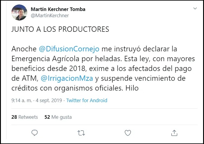 El ministro de Economía, Infraestructura y Energía, Martín Kerchner, anunció la medida a través de su cuenta de Twitter en la tarde de ayer. “Estos beneficios incluirán las contingencias climáticas ocurridas en los últimos días y les permitirá a los productores mitigar el impacto de las mismas”, declaró en la red social. Kerchner informó también que se extenderá la ampliación del vencimiento del Seguro Agrícola al próximo 16 de setiembre.