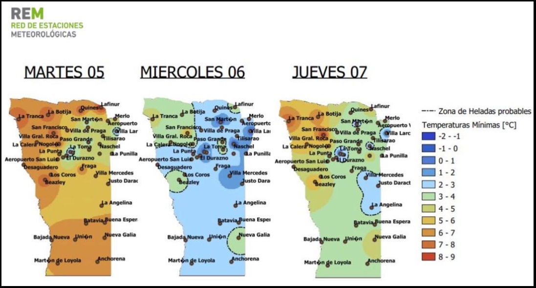 La Red de Estaciones Meteorológicas ha emitido un pronóstico de heladas para martes, miércoles y jueves. El miércoles será el día más frío. El mapa de San Luis se encuentra marcado con varias zonas donde se pronostican temperaturas por debajo de cero grado.