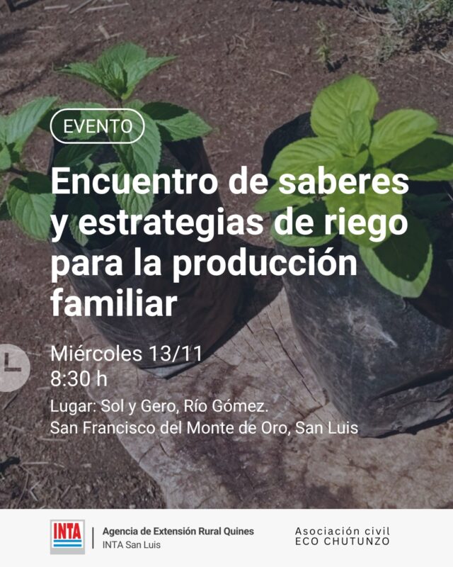El encuentro será el miércoles 13 de noviembre próximo desde las 8:30, donde el Ing. Agr. Jorge Santillán de Agencia de Extensión Rural Quines del INTA presentará estrategias de riego aplicables para la región y sus sistemas productivos familiares para realizar un eficiente uso del recurso hídrico disponible.