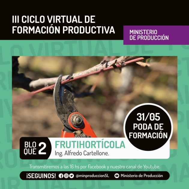 Este lunes 31 de mayo, a las 16:00, llega la séptima charla del III Ciclo Virtual de Formación Productiva. En esta oportunidad, la capacitación estará a cargo del jefe del Subprograma Colonia Agrícola de Sol Puntano, Alfredo Cartellone, quien disertará sobre “Poda de formación”.