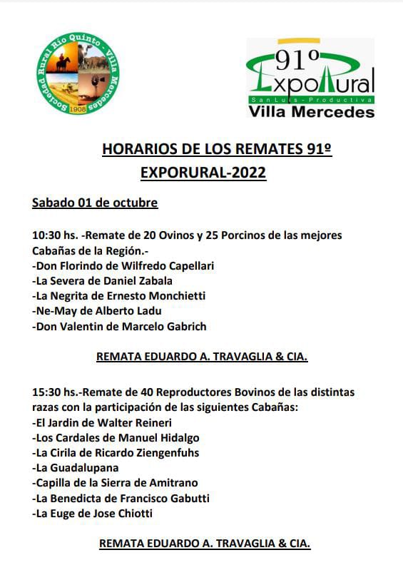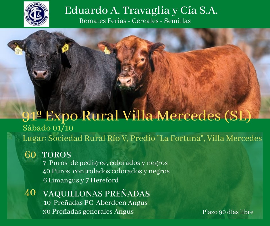 La 91º edición de la Expo Rural Río Quinto tendrá un plato fuerte para los ganaderos. El sábado 1 de octubre la consignataria tradicional de la muestra, Travaglia & Compañía, subastará 60 toros Angus, Limangus y Hereford, y 40 vaquillonas preñadas Angus, puras controladas y generales, todos provenientes de siete cabañas, tres de las cuales son de San Luis.