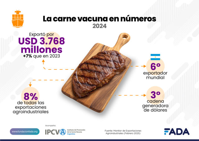 Somos primeros exportadores mundiales de jugo y aceite de limón y de aceite de soja. Estamos segundos con maní, porotos y yerba y terceros con maíz y harina de soja. Nuestro trigo llega a más de 28 países y en más de 90 disfrutan nuestras uvas y vinos. “Podemos destacar la carne vacuna argentina, que es muy bien recibida en el mundo: estamos en las mesas de más de 54 países. Esta cadena exportó en 2024 un 7% más que en 2023 y representa en 8% del total de las exportaciones agro, es la 3° cadena generadora de dólares y ocupa el 6° puesto a nivel mundial en el comercio de carne”, explica Pisani Claro.