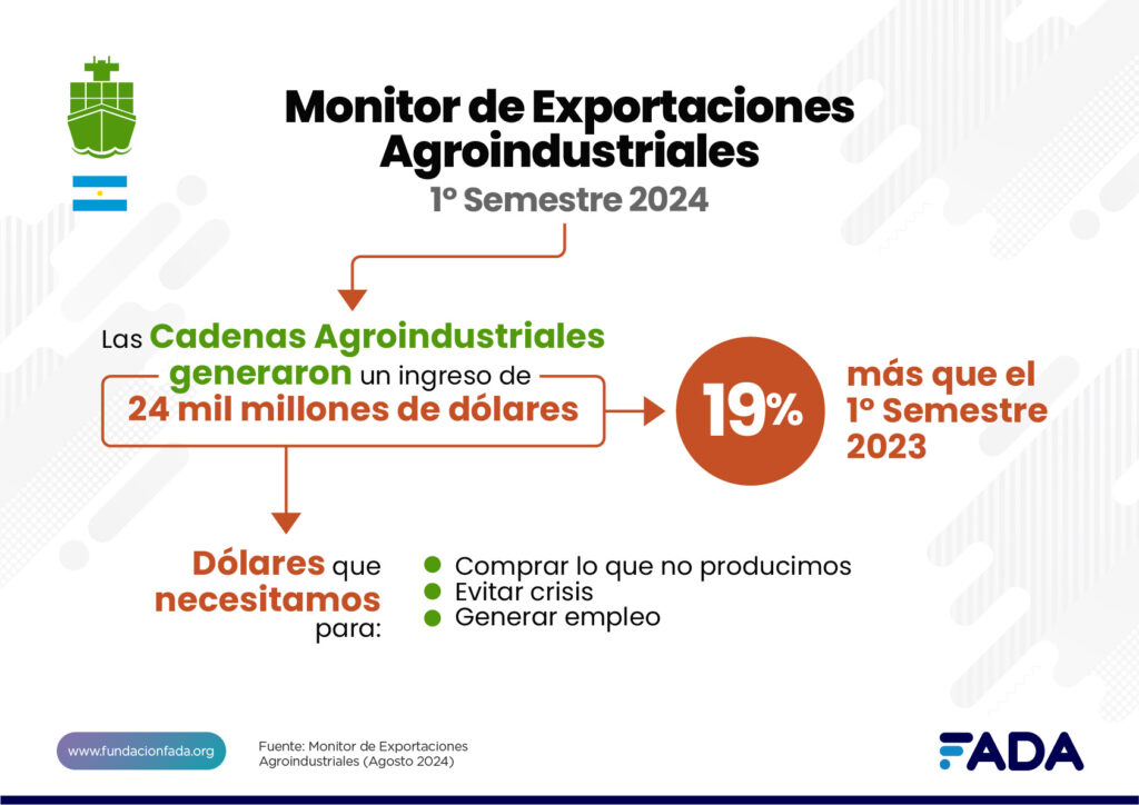 El informe que lanzó FADA (Fundación Agropecuaria para el Desarrollo de Argentina), revela que actualmente las cadenas agroindustriales traen 6 de cada 10 dólares que ingresan al país, en total en el primer semestre 2024 se acumularon 24 mil millones de dólares. Esas divisas son necesarias para comprar lo que no producimos, evitar crisis y generar más empleo.
