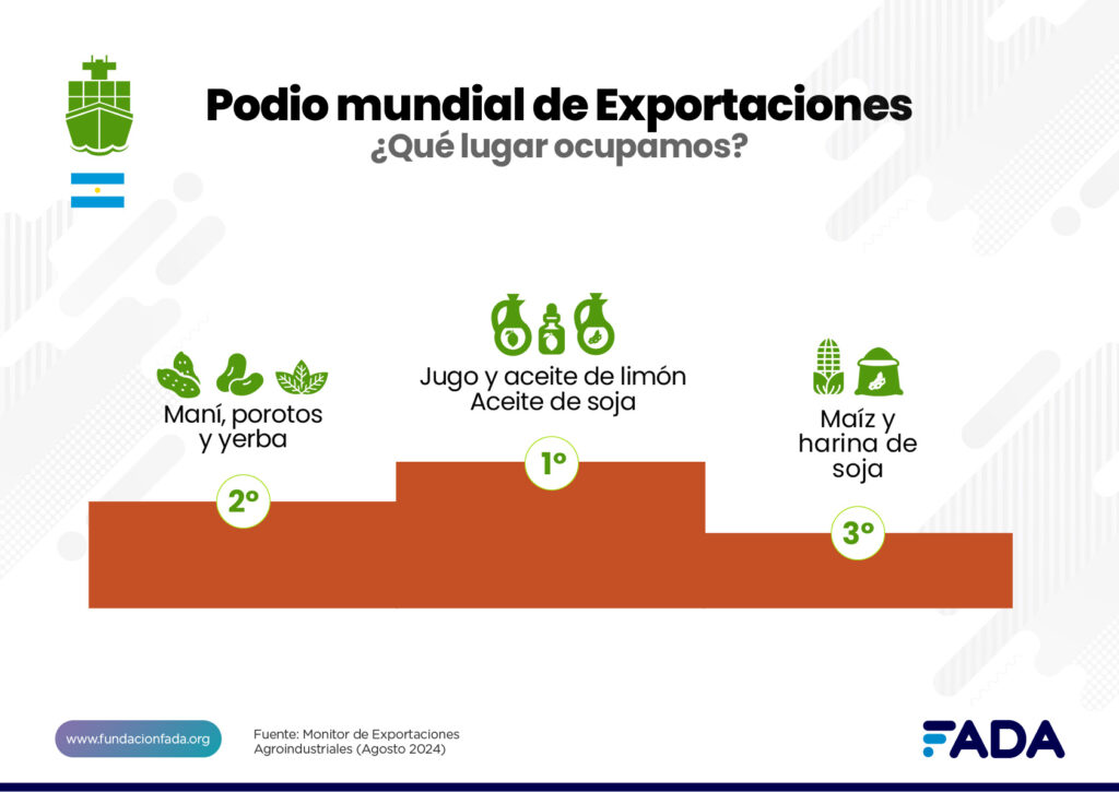 Crecieron casi un 20% las exportaciones del agro, pero con problemas. Aún mucho por hacer: pocos acuerdos internacionales y muchas trabas: ¿Qué frena a Argentina para escalar en el comercio global? 6 de cada 10 dólares vienen de la agroindustria. Limón, maní y maíz están en el podio mundial, ¿Con qué más somos campeones? El informe que analiza qué pasa con nuestros productos en el mundo.