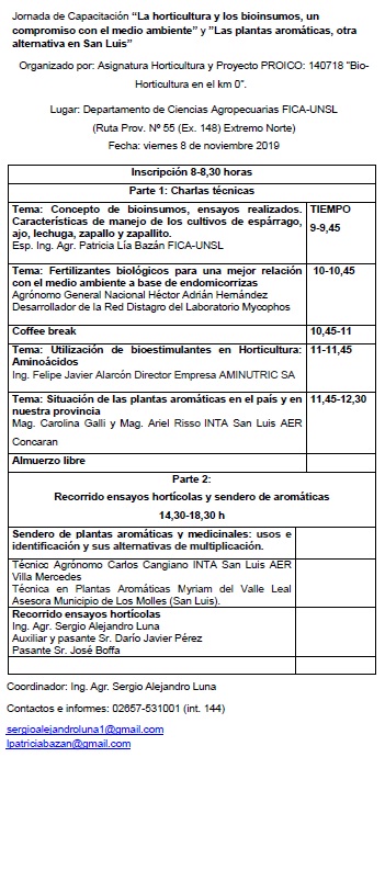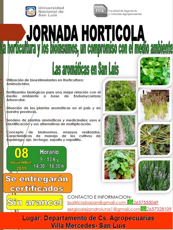 La Coordinación de Extensión, Vinculación y Transferencia de la Facultad de Ingeniería y Ciencias Agropecuarias de la UNSL informó que se desarrollará una Jornada de Capacitación sobre “La horticultura y los bioinsumos, un compromiso con el medio ambiente” y ”Las plantas aromáticas, otra alternativa en San Luis”