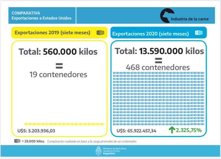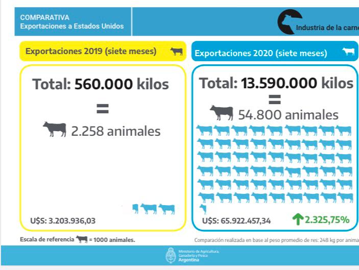 El Ministerio de Agricultura, Ganadería y Pesca de la Nación informó que las exportaciones de carne bovina a Estados Unidos aumentaron 2325,75% entre enero y julio de este año, en comparación con el mismo período de 2019