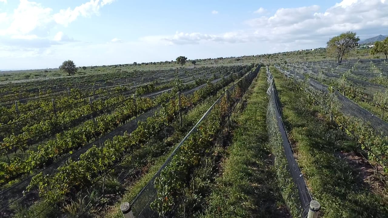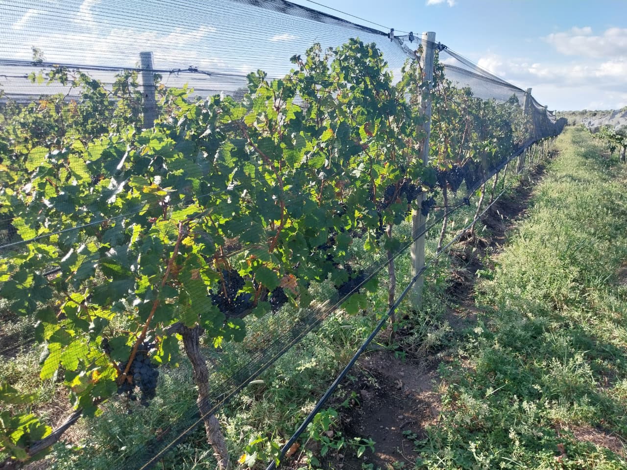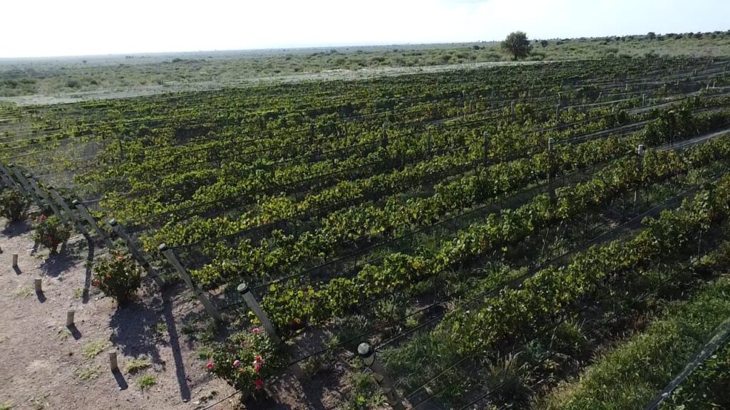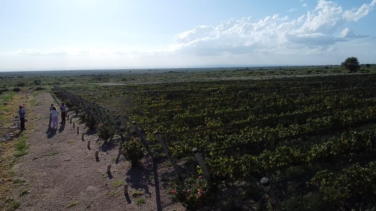 Fueron exactamente 6.558 plantas, “6.500, me acuerdo patente”, dice Judith con una sonrisa, distribuidas en cinco cepas, Cabernet Franc, Cabernet Sauvignon, Ancellotta, Pinot Noir y Malbec. Las variedades llegaron desde Mendoza y fueron implantadas a pie franco, con riego por goteo abastecido por el acueducto que conduce agua cruda hacia la ciudad de La Punta, provista por San Luis Agua.