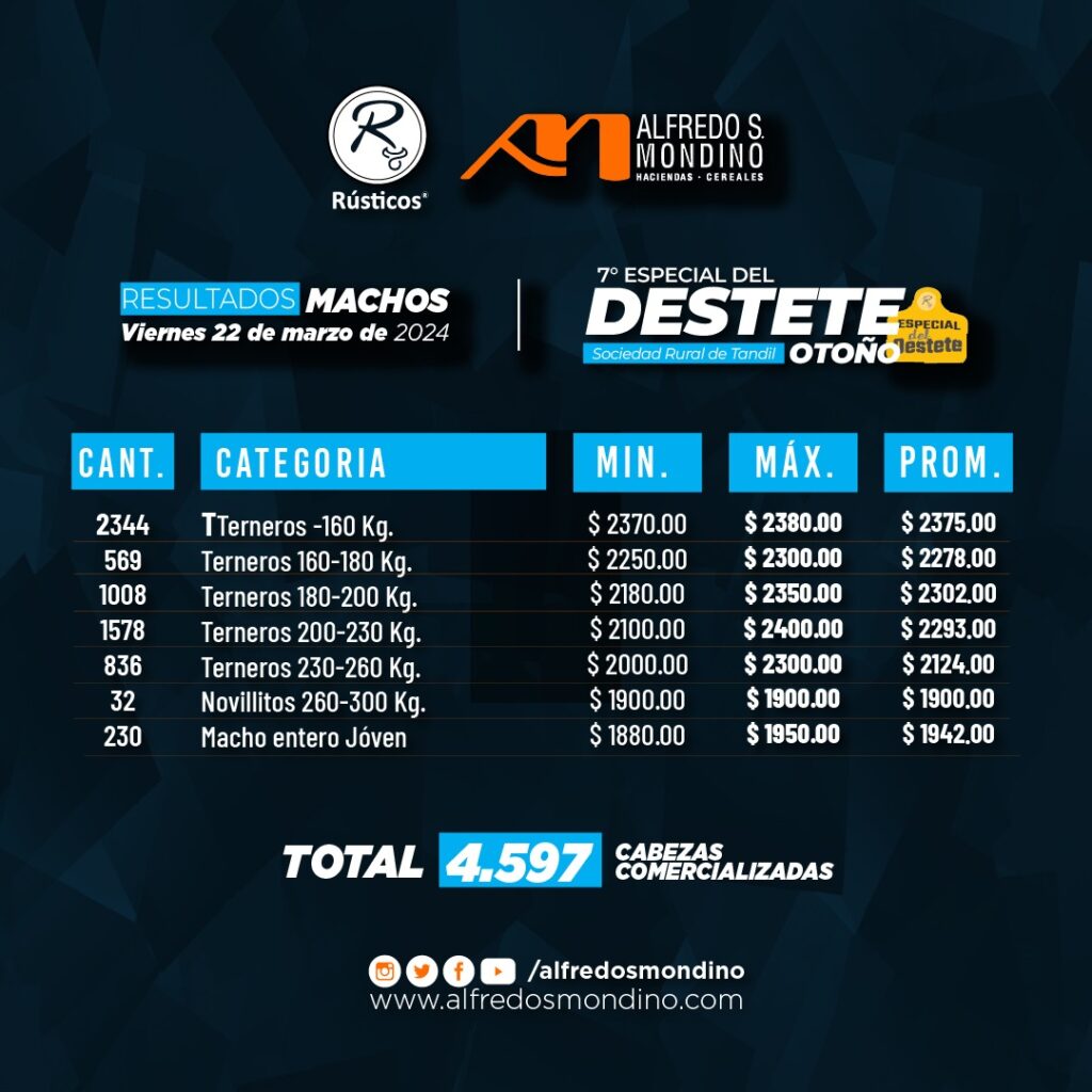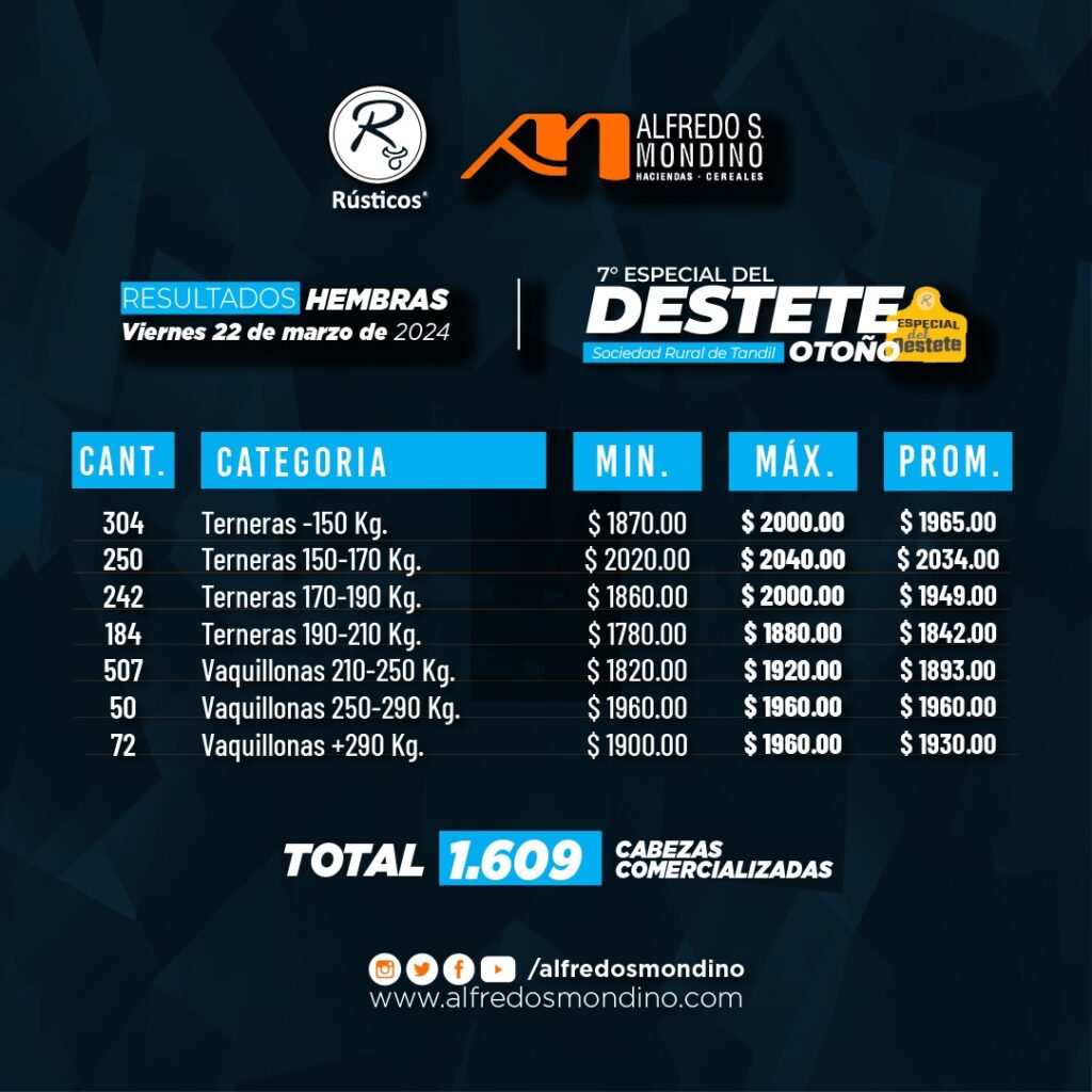 En el séptimo remate especial destete de otoño, las hembras de hasta 150, kilos alcanzaron un promedio de $1.965; las de 150 a 170 kilos, $2.034; las de 170 a 190 kilos, $1.949, y las de 190 a 210 kilos, $1.842.