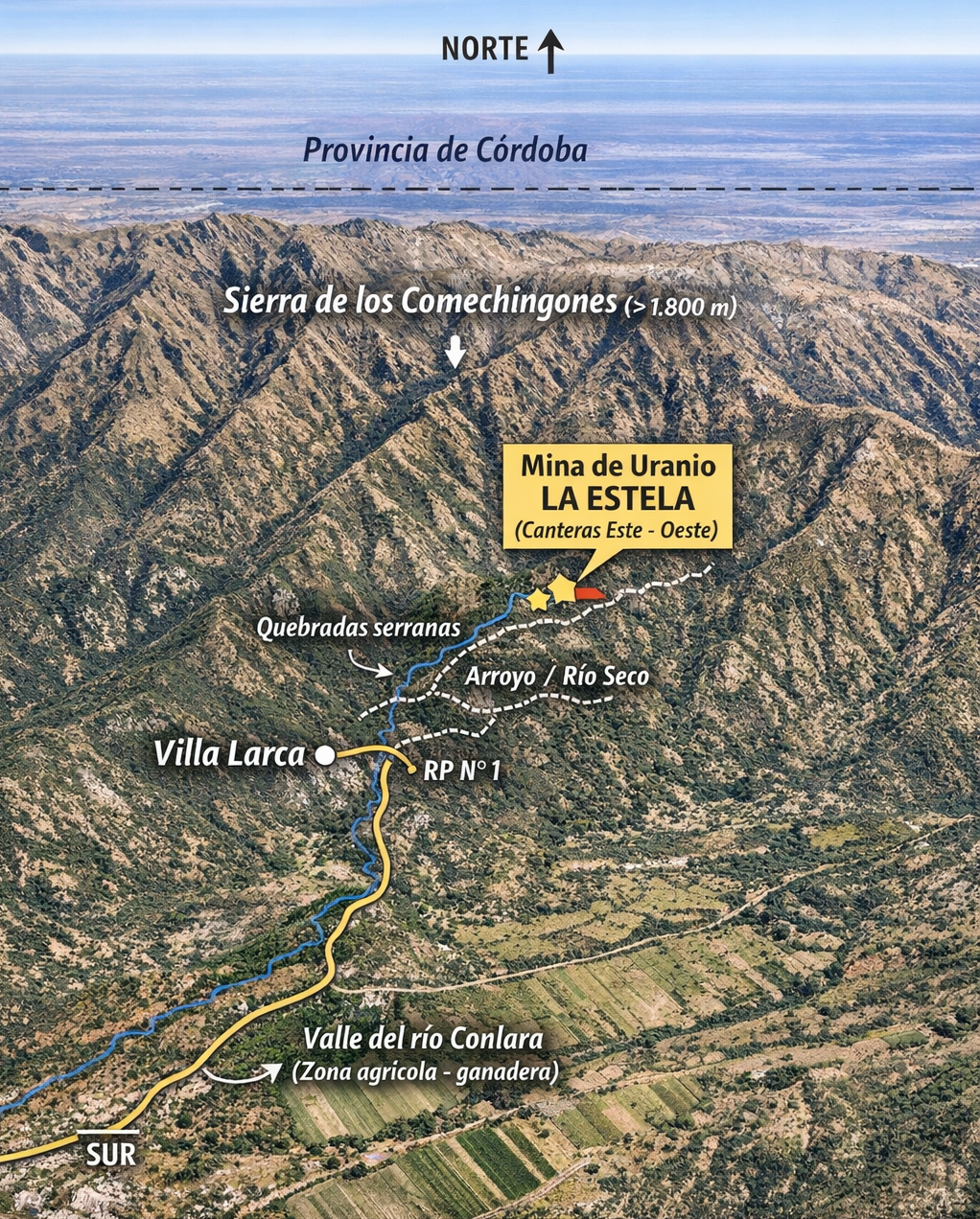 El interés por el uranio también se extendió a distintos puntos del valle del Conlara, zona que combina aptitud agrícola-ganadera con un subsuelo de características complejas desde el punto de vista estructural.