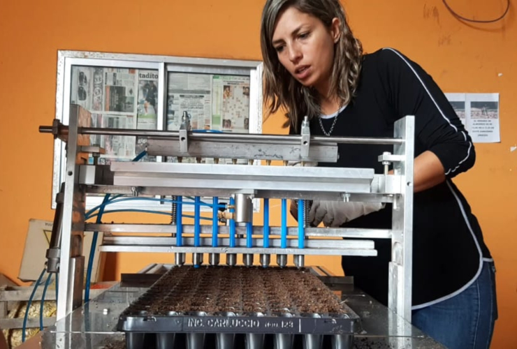 Como parte del Plan, la cartera productiva sumó dos máquinas sembradoras de bandejas, para acelerar su producción. Se trata de un equipamiento que funciona por compresión de aire y succión, y que prepara entre 50 y 60 bandejas por hora (mirar video explicativo).